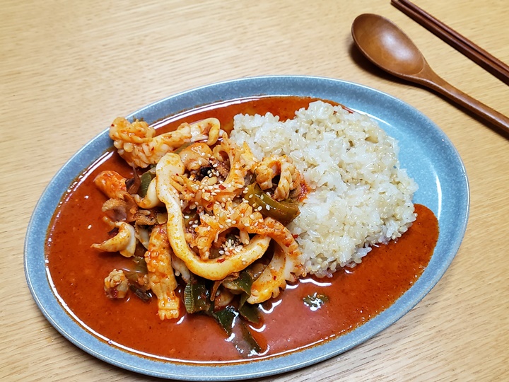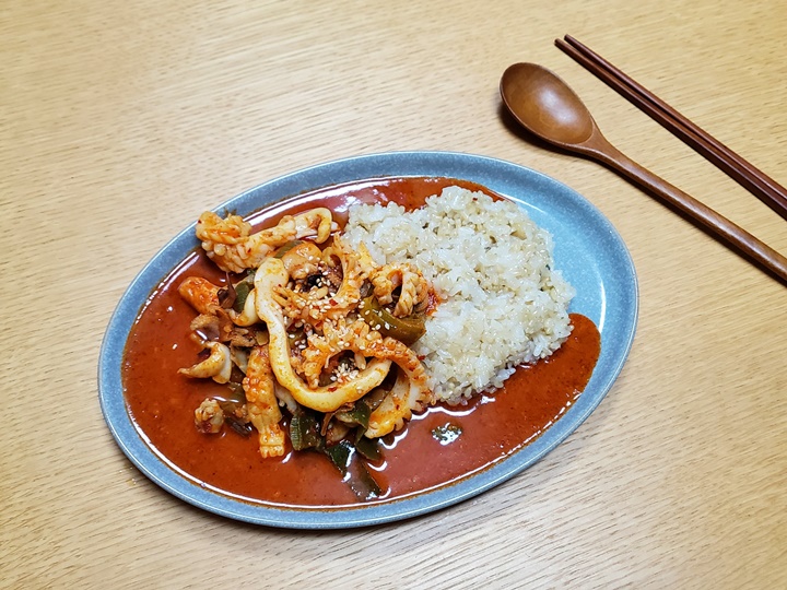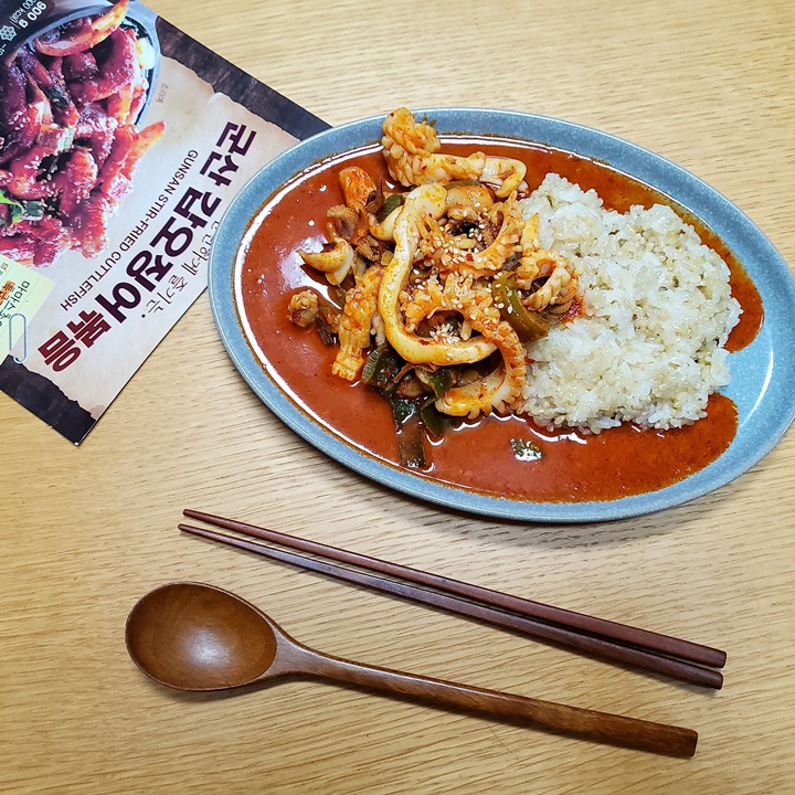 오징어덮밥을 좋아하는 편이라 덮밥으로 먹으려고 밥 위에 얹었다. 국물도 이 정도는 있어서 비벼먹을 때 맛있다는~~ 양파, 대파뿐만 아니라 갑오징어도 상당히 큼지막한 조각이라 씹는 맛을 제대로 느낄 수 있어서 좋다. 잔챙이는 거의 없음 ^^