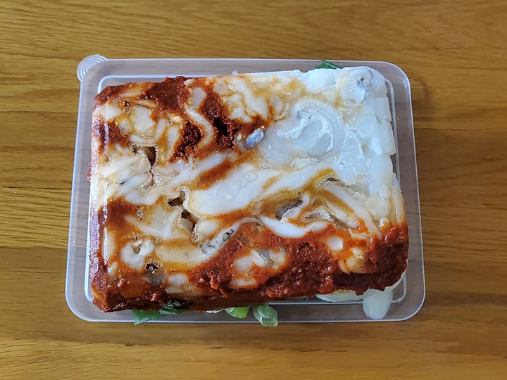 꽁꽁 얼려있는데 뒤집어보면 이런 상태~ 고춧가루 베이스 양념장도 드문드문 보인다. 처음이라 양념의 양에 대해서 별생각 없이 다 넣었는데, 먹으면서 생각한 것이 양념 양을 좀 덜어낼 걸 하는 것이었다. 예상했던 것보다 맵기도 했고, 상당히 짜기 때문이었다. 특히 덮밥류로 만드는 거라면 꼭 양념양을 조절하는 것이 좋을 것 같다.