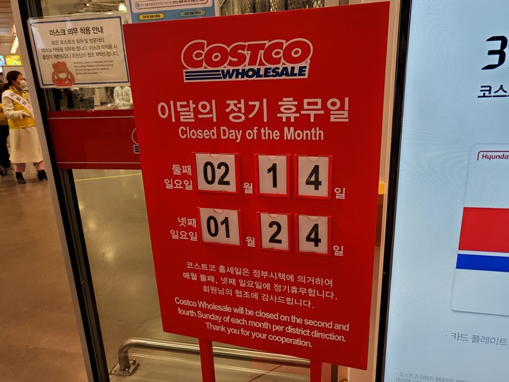 코스트코 공세점 영업시간 및 휴무 코스트코 홀세일은 정부시책에 의거하여 매월 둘째, 넷째 일요일에 정기휴무하여 다음 휴무일은 1월 24일, 2월 14일이다. 코스트코 공세점 영업시간은 오전 10시부터 오후 9시 30분까지인데 수도권 지역의 거리두기 2.5단계가 연장됨에 따라 21시까지 영업한다. (1월 17일까지) 계산 마치고 영수증 검사받고 나오니 8시 36분이었는데 입구는 문이 닫혀 있었다. 매장 입장은 20시 30분까지 가능하다.