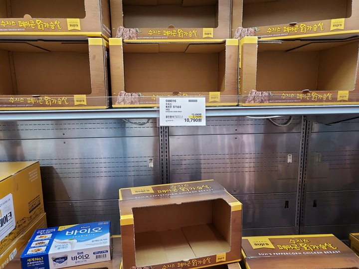딸기랑 수지스 닭가슴살 사려고 간 건데... 닭가슴살은 품절이었다! 왜 그런가 했더니 원래도 인기 많은데 할인중이라 냉텅이었던 듯! 오늘 또 코스트코에 가기엔 매우 귀찮고 붐빌 것 같아서 패쓰 ㅠㅠ
