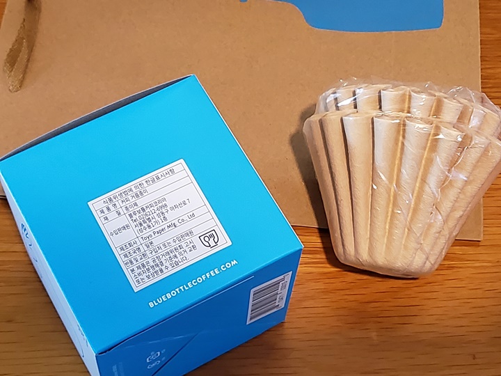 블루보틀 핸드드립 세트로 드리퍼, 카라페(저그), 필터 3종을 구입했다. 사은품으로 블루보틀 커피 원두 30g과 종이백도 챙겨주었다. 사은품 원두로 벨라 도노반을 선택했는데 넘흐 맛 좋아서 바로 원두도 구입하고 말았다!