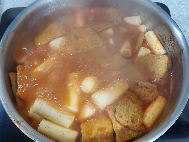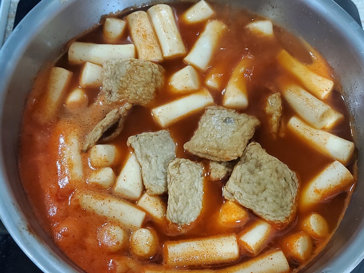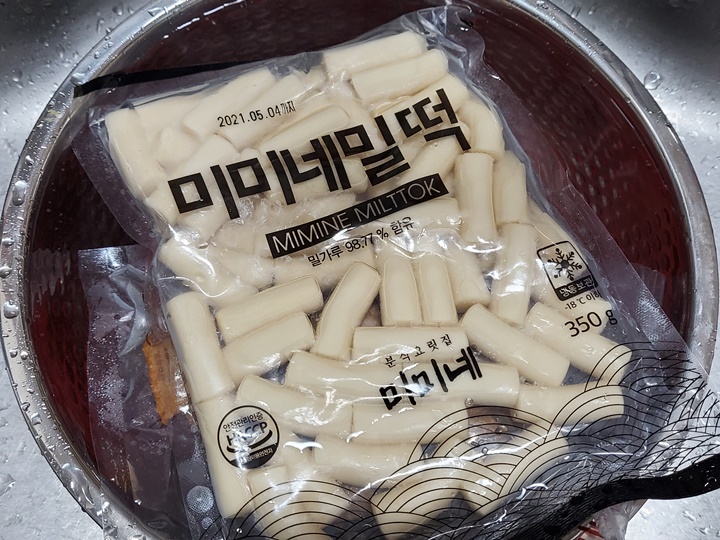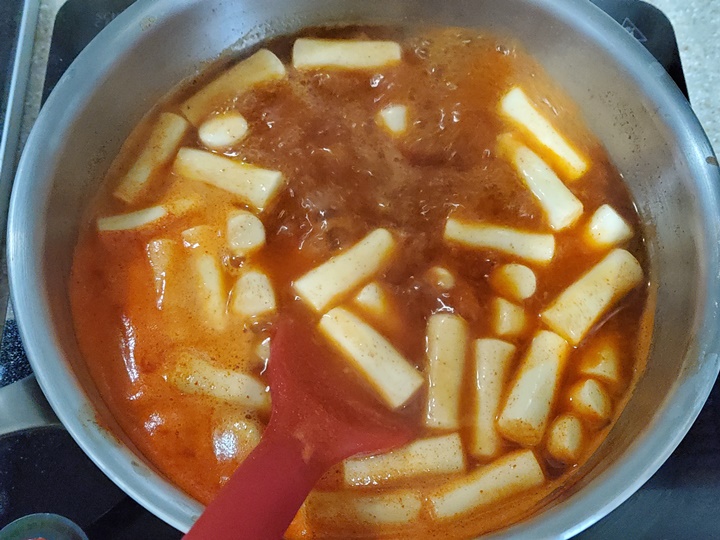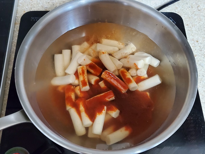 물을 350ml 넣은 팬에 해동된 떡과 소스를 넣고 끓여준다. 떡이 끓으면 많이 부풀게 되니 넉넉한 냄비를 이용하는 것이 좋고, 짧게 끓여야 국물이 맑고 깔끔하니 맛이 더욱 좋다.