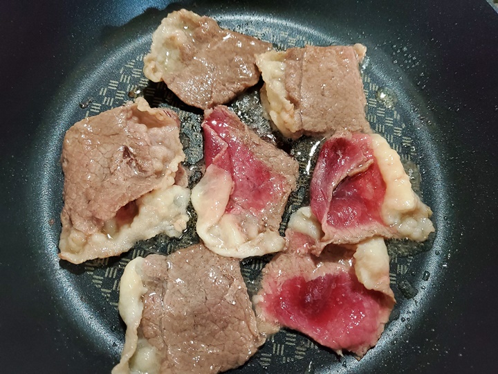 이번에는 차돌을 함께 넣어 끓이지 않고, 차돌을 토핑으로 올리는 방법으로 조리해서 떡이 하나둘 떠오르면 어묵만 넣고, 차돌은 따로 팬에 구웠다.