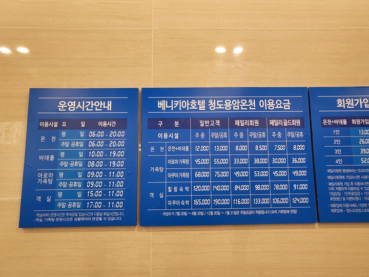 베니키아호텔 청도용암온천 가족탕 이용요금 아로마 가족탕 45,000원 아쿠아 가족탕 68,000원이다. 일반고객, 패밀리회원, 패밀리골드회원 가격이 다르지만 인터넷 예약 후 방문하면 주중 웰빙가족탕 33,000원 / 주중 아쿠아가족탕 49,000원 /주말 웰빙 가족탕 38,000원 / 주말 아쿠아 가족탕 53,000원 에 이용 가능하다.
