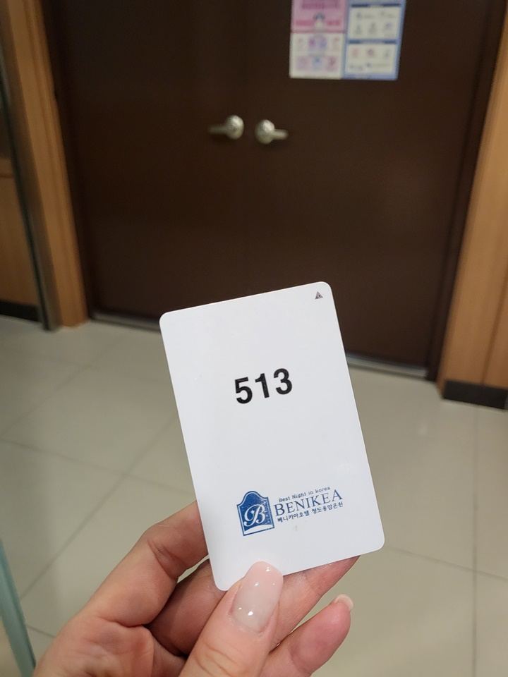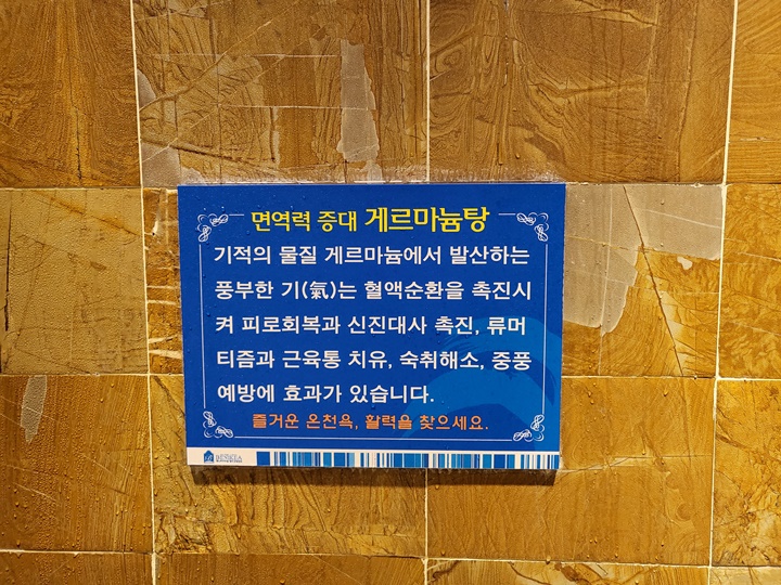 5층은 웰빙객실, 6층은 아쿠아객실인 듯. 우리 가족이 배정받은 객실은 513호 게르마늄실이었다. 객실 문마다 어떤 타입인지 객실번호 아래 쓰여있다. 금실에 배정받고 싶었지만 게르마늄실이었고, 요즘 가족탕 수요가 많다 보니 복도가 시끌벅적했다. 뛰어다니는 소리, 떠드는 소리가 매우 잘 들리는 편이다. 숙박객은 많지 않은지 늦은 밤에는 큰 소음이 나지 않았다.