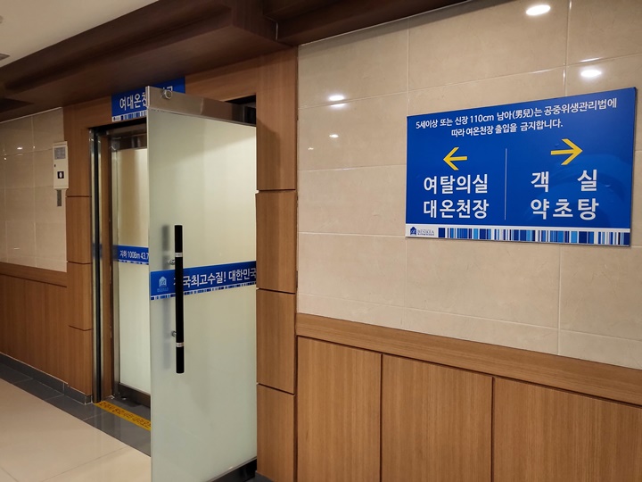 1층 로비에서 예약 확인 후, 추가금 결제하고 객실 카드키를 받아서 5층으로 올라왔다. 특이하게 여자 대온천장 입구가 객실, 약초탕과 같은 5층에 있다. (엘리베이터 1대 있음)