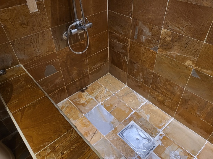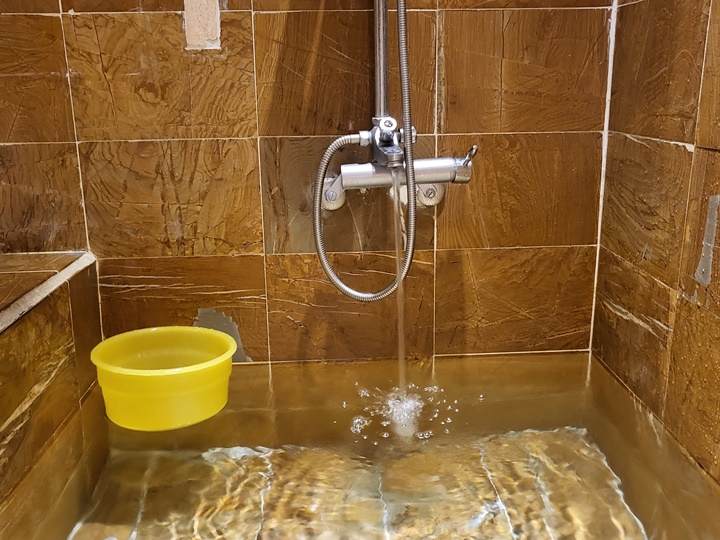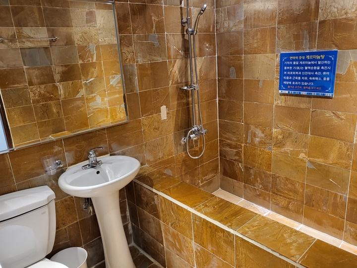 자, 진짜 본론은 여기부터! 가족탕이니까 욕실이 가장 중요하니까. 욕실은 얼핏 보면 금탕 같은 게르마늄탕으로 타일 욕조와 세면대, 변기가 한 공간에 자리한다. 공간은 협소한 편이지만, 욕조 깊이가 깊어서 물 받는데 시간이 꽤 걸리는 편이다.