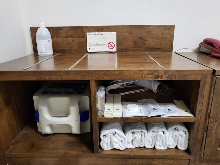 드라이어와 컨디션 매우 좋은 수건, 욕실 어메니티가 준비되어 있으나 샴푸, 바디워시 등은 챙겨 오는 게 좋을 것 같다. 생수는 객실 내 미니 냉장고에 2병 들어있다.
