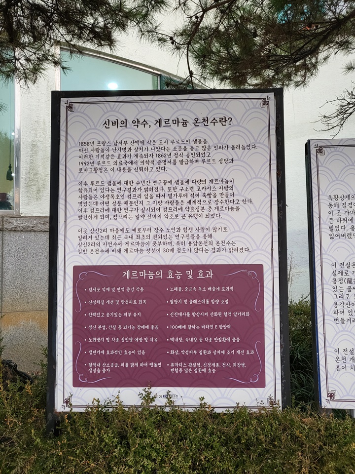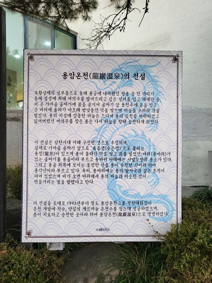 여느 유명 온천과 마찬가지로 우리 온천수 이렇게 좋다는 안내문구도 빠뜨리지 않는다. 용암온천이 화산 폭발할 때 그 용암일 거라고 생각했는데 용바위, 용암이었다. 게르마늄 온천수로 용이 치료하고 승천한 곳이라 용암온천이라 이름 붙였다고 한다.